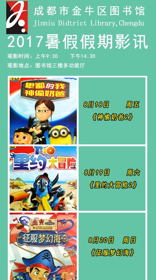 金牛区图书馆2017年暑期公益少儿电影展播将于2017年8月18日至2017年8月24日举行